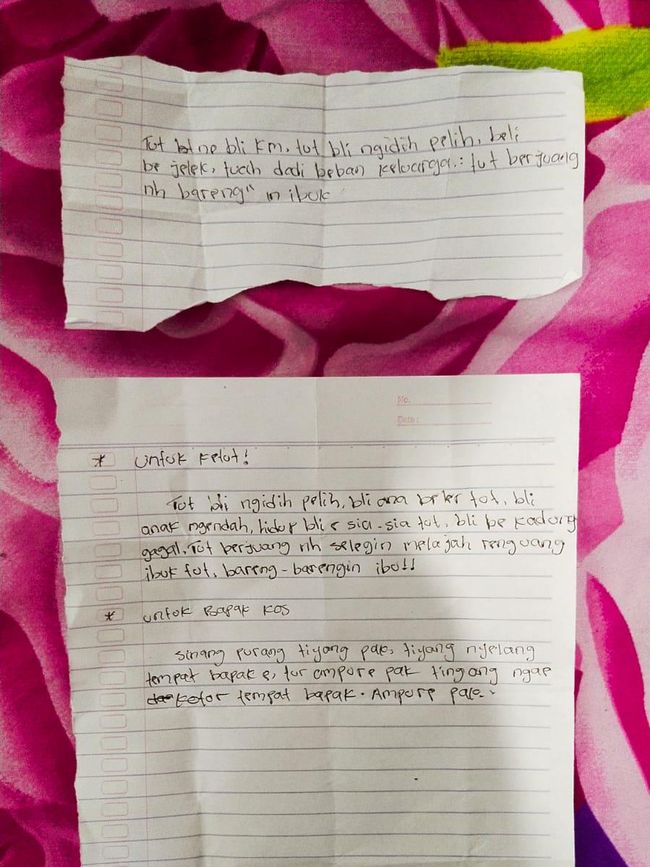 Tragis dan makin bikin syoknya, mendiang sempat meninggalkan dua pucuk surat di kamar Nomor 06, tempat ia gantung diri.