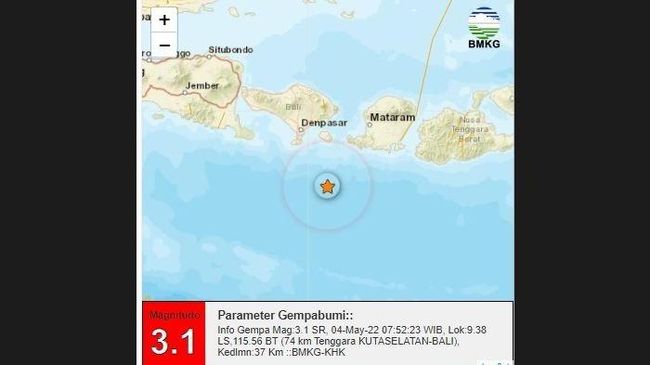 Gempa bumi berkekuatan (Magnitudo) 3,1 terjadi di perairan dekat Kuta Selatan, Kabupaten Badung, Bali, pada Rabu (4/5/2022).