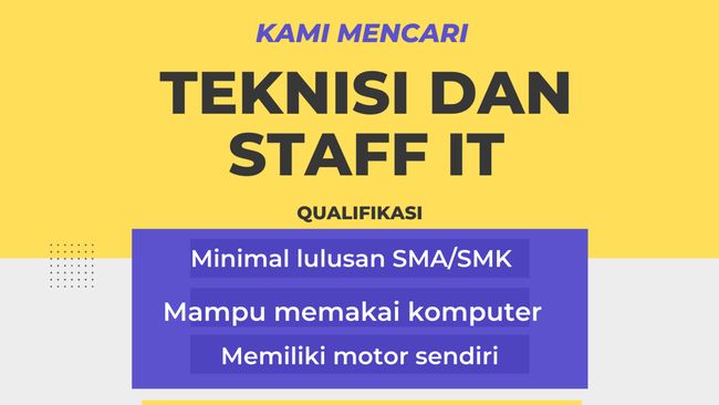 2. Minimal SMU/SMK/D3/SMKI (diutamakan yang berpengalaman)