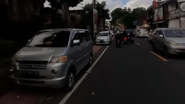 Dalam video itu, tangan kiri pengendara sepeda motor nampak terlihat memegang stang sembari membawa sepuntung rokok. Pengambil video kemudian merekam mobil-mobil yang terparkir di atas trotoar Jalan Raya Ubud.