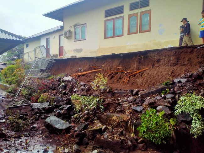 Pondasi tersebut jebol, kata Ariadi diduga terjadi lantaran pondasi tidak kuat menahan guyuran air hujan yang cukup deras. Akibatnya sebagian akses jalan menuju SD 1 Bengkala tertutup oleh material longsoran.