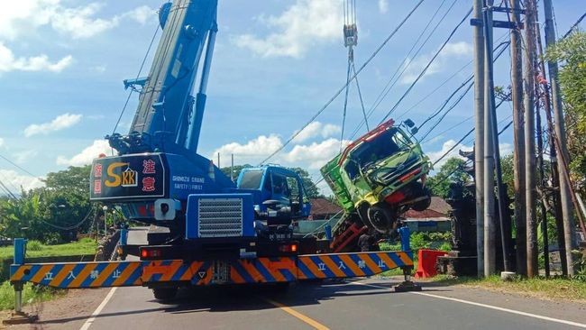 Truk yang terjun bebas ke sungai Biluk Poh di perbatasan Kelurahan Tegalcangkring dan Desa Penyaringan, Kecamatan Mendoyo, Kabupaten Jembrana, Bali akhirnya berhasil dievakuasi, Selasa (31/5/2022). Truk yang dikemudikan oleh Muktar Ahmad Dahlan (44) itu sempat oleng dan menabrak pembatas jembatan sebelum terjun bebas ke sungai pada Senin (30/5) kemarin.