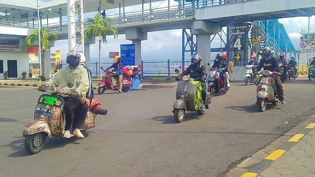 Pantauan detikBali Rabu (8/6/2022) siang, pengendara Vespa terlihat banyak yang turun dari kapal penyeberangan di pintu masuk Pelabuhan Gilimanuk.