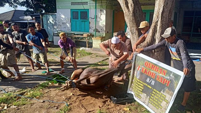 "Nantinya 3 ekor sapi dagingnya akan dibagi 500 begitupun dengan 24 ekor kambing dagingnya juga akan dibagi 500, jadi berapapun nanti yang didapat tetap harus disyukuri supaya semua masyarakat kebagian daging kurban walaupun sedikit," kata Rahmat Wahyudi.