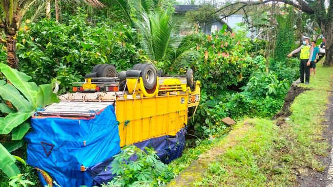 Karena jalur yang sedang dilalui mendadak dipotong kendaraan itu, sopir truk diduga kaget dan langsung banting setir ke kiri. Bantingan yang keras dan mendadak itu membuat truk jatuh ke kebun milik warga di utara jalan dengan posisi terguling pada kedalaman sekitar 4 meter di bawah permukaan jalan.