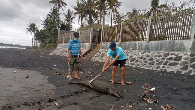 Seekor lumba-lumba gigi kasar atau jenis Steno Bredanensis ditemukan mati terdampar di Pantai Perancak, Jembrana, Bali, Minggu pagi (28/8/2022). Relawan Kelompok Konservasi Penyu Kurma Asih Perancak langsung mengubur bangkai lumba-lumba yang sudah mulai membusuk tersebut.