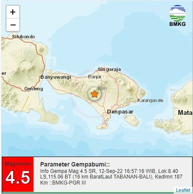 Gempa M 4,5 hari ini mengguncang Tabanan pukul 16:57:16 WIB, Senin, 12 September 2022.