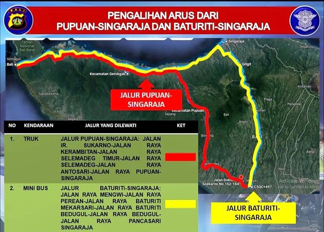 Berdasarkan pengumuman di akun Instagram Polres Tabanan, pengalihan arus lalu lintas ini melalui rute Kecamatan Baturiti dan Pupuan menuju Singaraja.