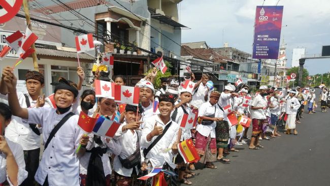 Ratusan siswa SMP turut menyambut para delegasi Konferensi Tingkat Tinggi (KTT) G20. Mereka tampak mengenakan pakaian adat Bali dan memegang bendera berbagai negara berukuran kecil di sekitar Bandara I Gusti Ngurah Rai, Senin (14/11/2022).
