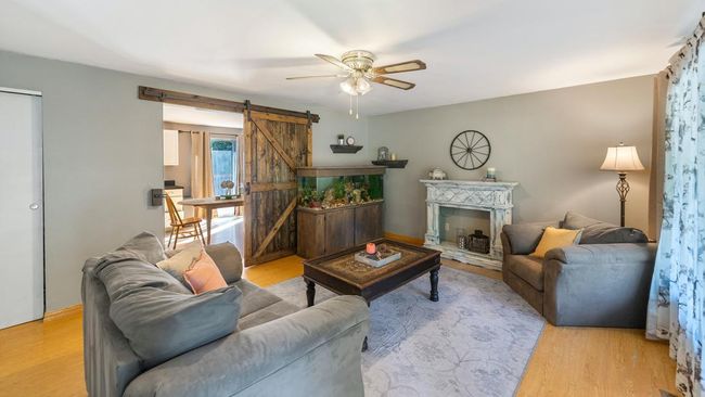 Sentuhan plafon berwarna putih memang selalu jadi pilihan tepat, meskipun hanya putih datar yang dipercantik dengan kipas kayu berlampu di bagian tengahnya. Ornamen furniture diberi sentuhan warna yang hangat seperti kayu dan abu-abu muda.