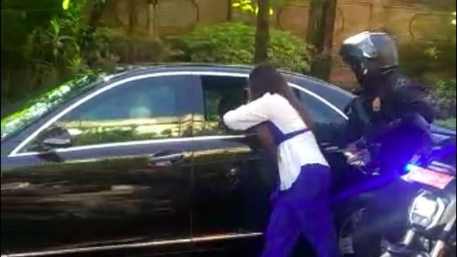 Tiba-tiba, ada seorang wanita mengenakan baju putih dengan celana biru menerobos pengamanan dan mendekati mobil Jokowi. Wanita tersebut tampak memasukkan tangannya ke kaca jendela tepat di samping Presiden Jokowi duduk.
