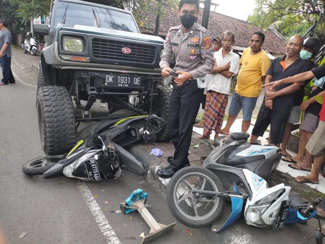Mobil yang dikemudikan I Komang Rata asal Desa Pempatan, Kabupaten Karangasem itu melindas dua motor hingga roda depan naik ke trotoar. Sementara satu motor lainnya rusak ringan.
