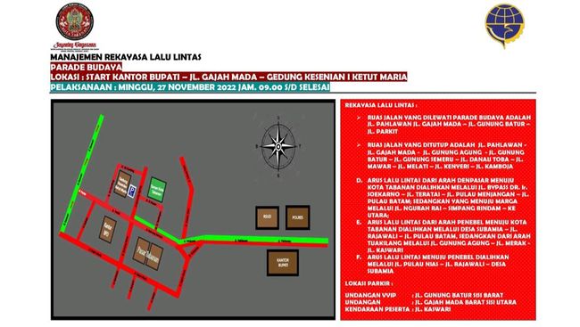 Sejumlah ruas jalan akan ditutup selama berlangsungnya parade budaya serangkaian Hari Ulang Tahun (HUT) Kota Tabanan ke-529, Minggu (27/11/2022). Penutupan jalan ini akan berlangsung dari pukul 07.00 Wita sampai parade tersebut selesai.