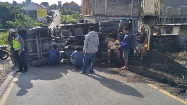 Truk bermuatan pasir terguling di shortcut Canggu, Kuta Utara, Badung, Rabu (30/11/2022) pagi. Badan truk yang menutupi ruas jalan sempat membuat jalur tersebut macet. Peristiwa itu pun ramai di media sosial.
