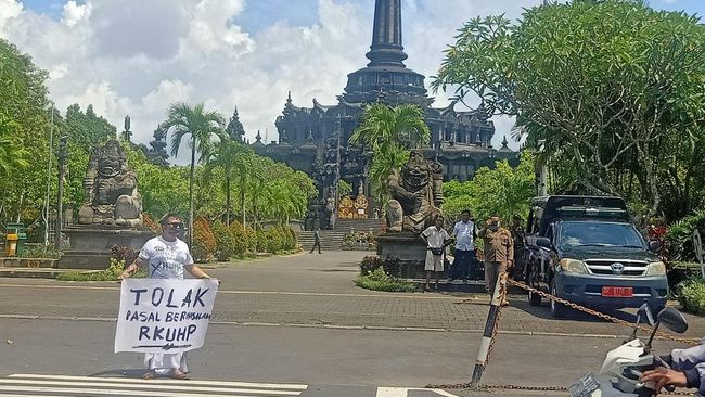 Dirinya pun turut membawa sebuah kertas yang bertuliskan 'Tolak Pasal Bermasalah RKUHP'. Kemudian, ia pun mulai berdiri di depan kawasan monumen Bajra Sandhi.