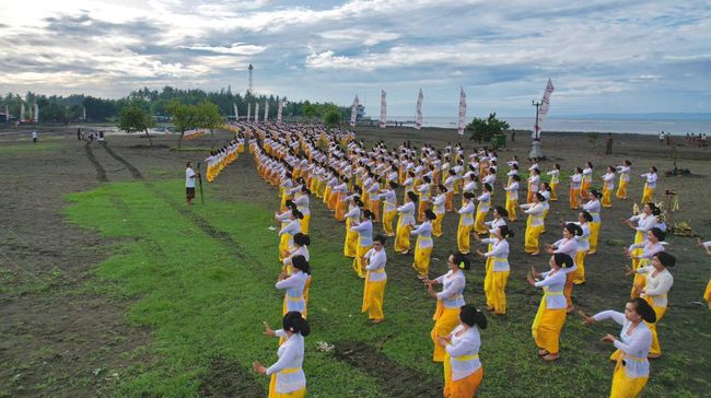 Sebanyak 1.000 ibu-ibu anggota Pemberdayaan Kesejahteraan Keluarga (PKK) membawakan Tari Rejang Renteng di Sirkuit All In One, pesisir Pantai Desa Pengambengan, Kecamatan Negara, Bali, Senin (26/12/2022) sekitar pukul 06.30 Wita. Menariknya, beberapa di antara mereka sudah berhias sejak pagi buta, pukul 02.00 Wita.