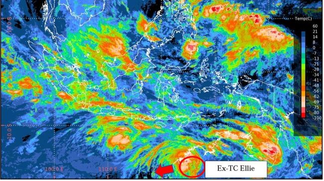 Berdasarkan citera satelit Himawari-9 EH, kemunculan eks siklon Ellie terlihat di barat benua Australia atau ada di sebelah tenggara pulau Bali.