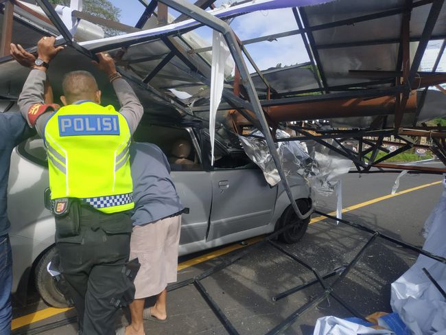 Satu unit mobil minibus jenis Avanza silver DK 1291 IB tertimpa baliho tumbang di jalur Denpasar-Singaraja, Selasa (3/1/2023) pagi. Tidak hanya mobil, baliho dengan rangka besi di Shortcut 3 di kawasan Bedugul, Kecamatan Baturiti, Tabanan, itu juga menimpa kabel utama PLN hingga tertarik.