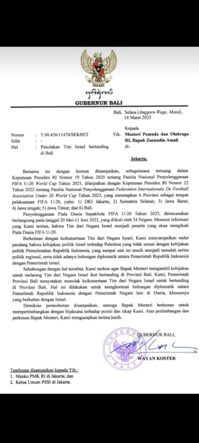 Gubernur Bali Wayan Koster melayangkan surat ke Menteri Pemuda dan Olahraga Zainudin Amali berisi penolakan Tim Kesebelasan Israel bertanding di Pulau Dewata. Israel diketahui jadi satu dari 24 tim yang akan bertanding di Bali dalam perhelatan FIFA U-20 World Cup 20 Mei-11 Juni 2023 mendatang.