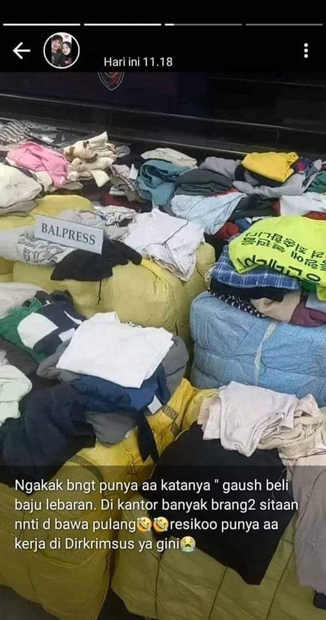 "Ngakak banget punya aa katanya 'nggak usah beli baju Lebaran. Di kantor banyak barang-barang sitaan nanti dibawa pulang. Risiko punya aa kerja di dirkrimsus ya gini," tulis caption status WhatsApp yang viral itu seperti yang dikutip pada detikNews.