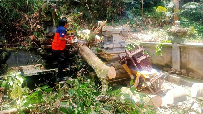 Bangunan pura di Banjar Dinas Perangsari Tengah, Desa Duda Utara, Kecamatan Selat, Kabupaten Karangasem, Bali, rusak tertimpa pohon, Jumat (7/4/2023). Pohon tersebut tumbang setelah hujan deras melanda belakangan ini.