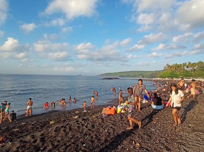Mereka datang sambil membawa canang untuk dipersembahkan di pantai. Anak-anak hingga orang tua berbaur.