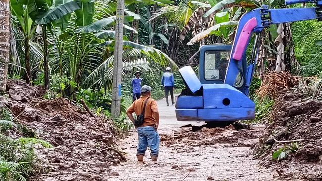 "Kemarin, Sabtu (27/5/2023), tidak bisa dilalui. Sudah sempat dibersihkan secara manual tapi tidak berhasil. Hari ini baru bisa dilalui karena sudah pakai ekskavator," imbuhnya.