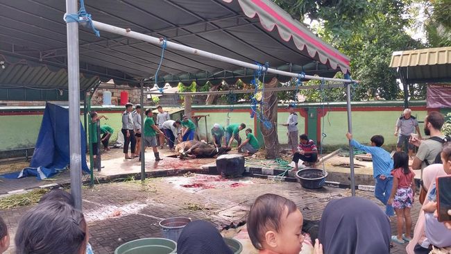 Sejumlah masjid melaksanakan penyembelihan hewan kurban di Hari Raya Idul Adha 1444 H/2023, Kamis (29/6/2023). Ada beberapa masjid besar di Kota Denpasar, Bali, yang tahun ini mengumpulkan hewan kurban cukup banyak.