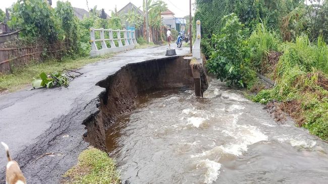 Sebagian wilayah di Kabupaten Klungkung, Bali, diguyur hujan deras pada Minggu pagi (2/7/2023). Akibatnya, jembatan di Jalan Candi Negara, Desa Kusamba, Kecamatan Dawan, Klungkung, jebol terkikis air.