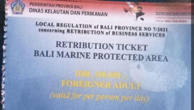 Di tanda retribusi tersebut tertulis "Retribution Ticket Bali Marine Protectetd Area IDR 100.000. Valid for one person per day." Selain itu, terdapat logo Dinas Kelautan dan Perikanan Bali di tiket retribusi tersebut. Berikut ini sejumlah keluhan terkait penerapan retribusi tersebut.