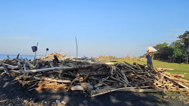 Sampah-sampah kayu yang menumpuk itu mengotori pantai. Namun, di sisi lain ternyata membawa 'berkah' bagi warga.