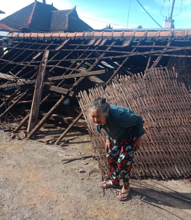 Sebuah rumah milik seorang lansia bernama Ni Ketut Sanur di Dusun Temakung, Desa Ban, Kecamatan Kubu, Kabupaten Karangasem, Bali, ambruk setelah diterjang angin kencang pada Selasa (11/7/2023). Lansia berusia 80 tahun itu kini tinggal di rumah kerabat terdekat.