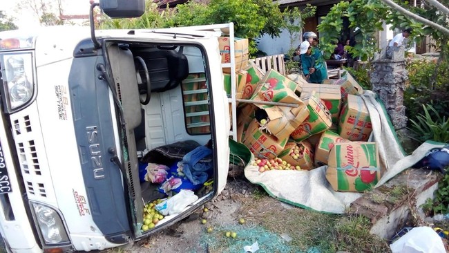 Kendaraan truk dengan nomor polisi B 9568 SCC yang bermuatan apel Malang terguling di jalur Denpasar-Gilimanuk, tepatnya di Desa Banyubiru, Kecamatan Negara, Kabupaten Jembrana, Jumat (28/7/2023).