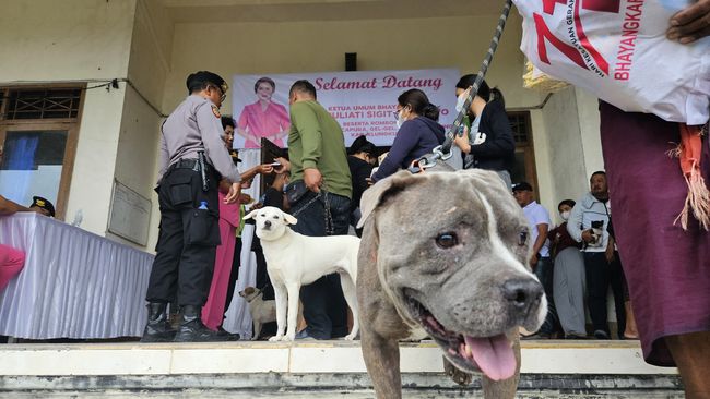 Warga antusias membawa anjing peliharaannya untuk mendapatkan vaksin antirabies ke GOR Swecapura, Klungkung, Bali Rabu siang (6/9/2023). Kegiatan bertajuk Bhayangkari Peduli itu turut dihadiri oleh Ketua Bhayangkari Nyonya Juliati Sigit Prabowo.