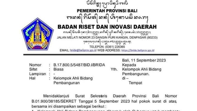 Hal tersebut disampaikan oleh Kepala BRIDa Bali I Made Gunaja melalui surat nomor B.17.800.5./5487/BID.I/BRIDA Tentang Kelompok Ahli Bidang Pembangunan yang terbit pada 11 September 2023.