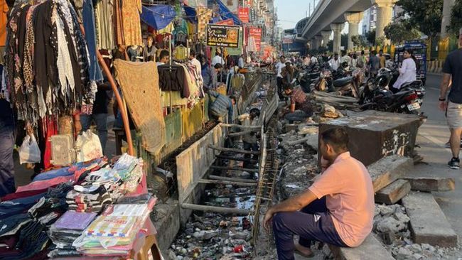 Kemudian ada juga foto pinggir jalan India yang terlihat sangat berantakan. Selokan yang dalam foto juga terlihat dipenuhi banyak sampah dan ada orang yang tengah mengambil sampah tersebut. Dekat pinggir selokan terlihat motor-motor parkir tak beraturan.