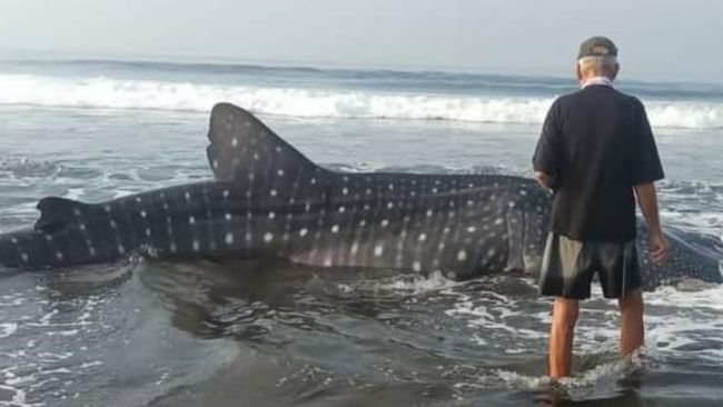 Hiu paus dengan ukuran besar ditemukan mati terdampar di Pantai Banjar Yehkuning, Desa Pekutatan, Kecamatan Pekutatan, Jembrana, Bali, Minggu (15/10/2023). Hiu paus berjenis tutul ini ditemukan oleh nelayan sekitar pukul 07.00 Wita.
