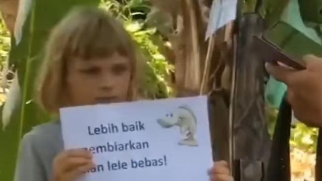 Baru-baru ini viral video bocah bule protes terhadap sejumlah warga di Bali memancing lele di empang. Bocah berambut pirang itu membawa selembar kertas, meminta warga tidak memancing lele itu.
