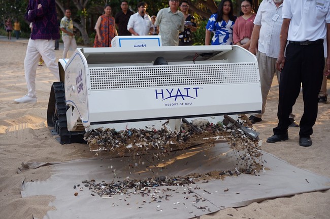 "Hyatt BeBot bisa menyedot sampai kedalaman 15-20 sentimeter di dalam pasir. Sehingga sampah-sampah yang diambil juga lebih bervariasi. Seperti pecahan kaca, plastik, bahkan sampai puntung rokok pun bisa kami dapatkan," terangnya.