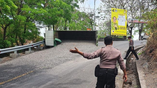 "Saat tiba di lokasi kejadian yang merupakan jalanan menurun dan tikungan, tiba-tiba per bagian bawah setir patah sehingga setir tidak bisa digunakan dan membuat laju truk tak terkendali hingga akhirnya terguling," kata Sapta.