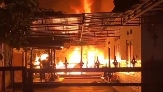 Rumah dan gudang milik Bambang Darmanto (46) di Banjar Kaliakah, Desa Kaliakah, Kecamatan Negara, Jembrana, Bali, terbakar saat ditinggal beribadah Natal di gereja, Jumat malam (22/12/2023). Penyebab kebakaran masih belum diketahui.