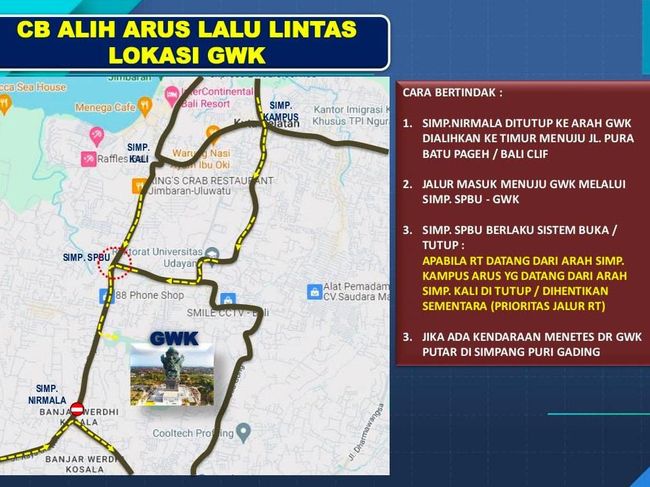 Jansen membeberkan pengalihan arus lalin menuju kawasan GWK akan dilakukan pada simpang Nirmala. Adapun, arus lalu lintas dari Uluwatu menuju GWK akan ditutup dan dialihkan ke arah timur menuju Jalan Pura Batu Pageh untuk selanjutnya mengarah ke Jalan Dharmawangsa.
