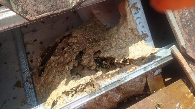 Sarang tawon berukuran besar berada di atap ruang Tata Usaha (TU) SMPN 3 Bebandem, Karangasem, Bali. Lima siswa menjadi korban sengatan tawon, Rabu (17/1/2024).