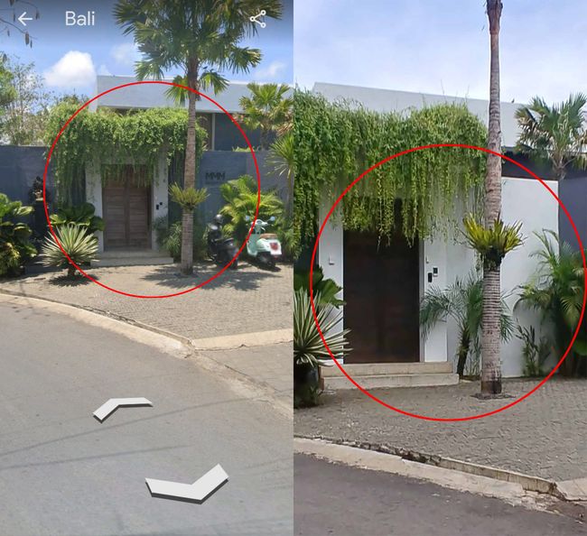 Warna sebagian bidang tembok depan vila itu juga sudah berganti dari abu kebiruan menjadi putih (berdasarkan pencocokan di Google Earth). Tulisan akrilik nama vila MMM yang terpampang di sisi kiri pintu juga sudah tak terlihat lagi.