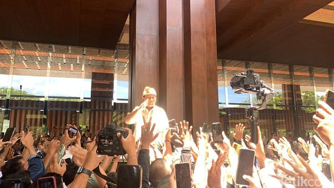 Calon presiden (capres) nomor urut 2, Prabowo Subianto, diserbu para pendukungnya seusai menghadiri hari ulang tahun (HUT) Partai Gerindra di Sanur, Denpasar, Bali. Mereka berdesakan untuk bisa salaman dengan Ketua Umum (Ketum) Gerindra itu sambil meneriaki 'Prabowo presiden'.