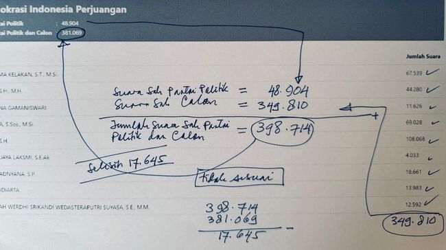 Selanjutnya, Koster menjumlahkan jumlah suara sah partai politik yang tertera di Sirekap, yakni 48.904 suara dengan total suara yang didapatkan sembilan caleg DPR RI PDIP dapil Bali. Akhirnya didapat jumlah suara sah partai politik dan calon sebanyak 398.810 suara.
