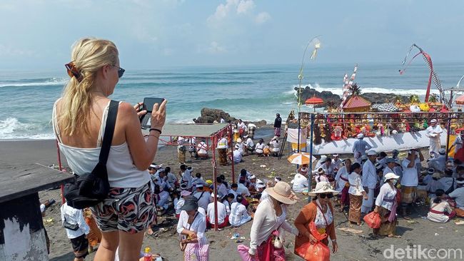 Di tempat berbeda, di Pantai Seseh, Badung, juga terlihat turis asing tengah menunggu tahapan persembahyangan warga Bali di pinggir pantai. Mereka mengaku kagum dengan keunikan kegiatan di Pulau Dewata.