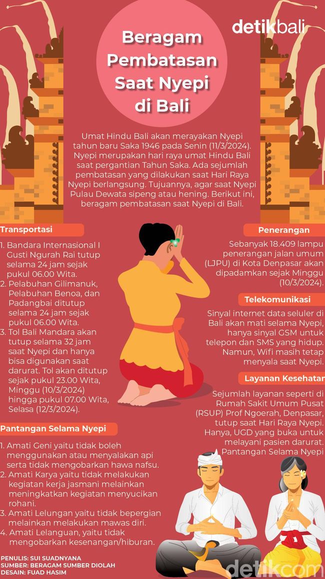Denpasar - Umat Hindu akan merayakan Hari Raya Nyepi tahun baru Saka 1946 pada Senin (11/3/2024). Nyepi tidak dirayakan dengan bersenang-senang, melainkan dengan Tapa Brata Penyepian, yakni menaati empat pantangan. Berikut pantangan dan pembatasan-pembatasan yang wajib ditaati saat Nyepi di Bali. Apa saja? Cek infografis di atas.