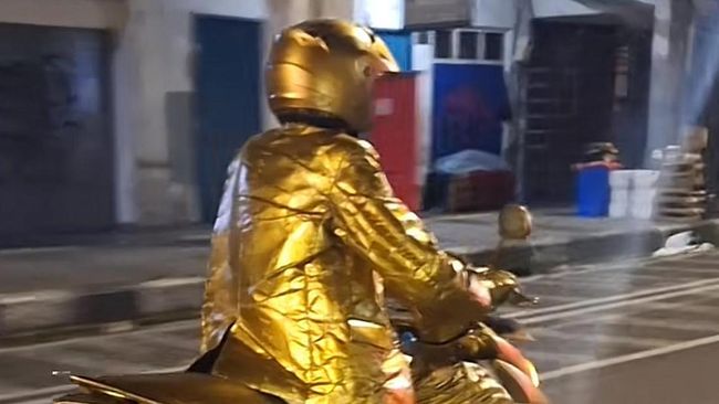 Tak hanya busana, motor yang ia gunakan juga berwarna emas. Helmnya pun berwarna emas mengkilap. Unggahan tentang aksi pria yang memakai baju serba emas ini langsung jadi sorotan.
