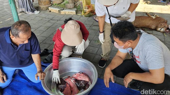Petugas mendatangi langsung lokasi pemotongan yang tersebar di semua kampung muslim di Kabupaten Klungkung, Senin (17/6/2024). Kabid Keswan Klungkung, Anak Agung Raka Arnawa, menjelaskan pemeriksaan terhadap hewan kurban, baik sapi maupun kambing dilakukan sebelum dipotong dan setelah dipotong.